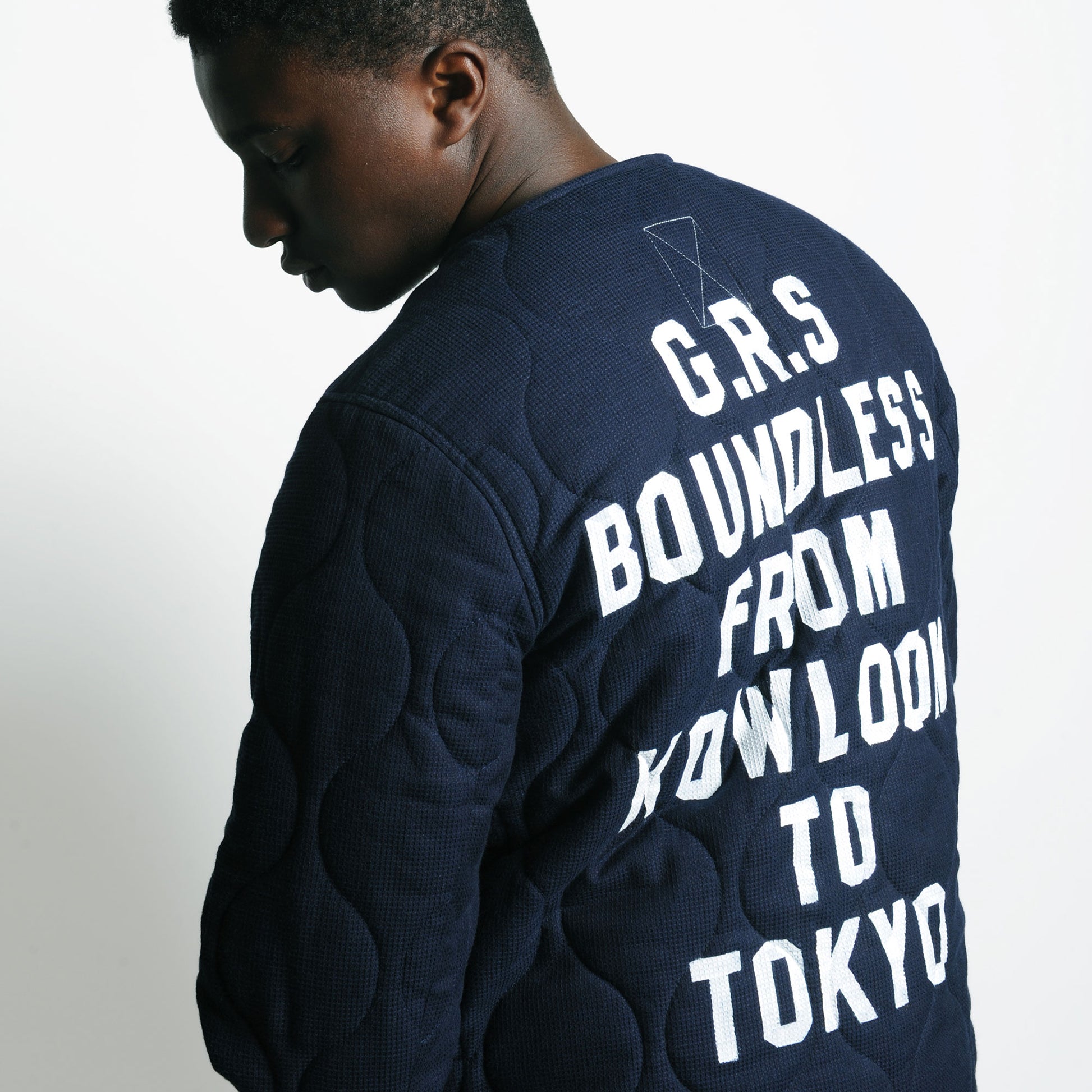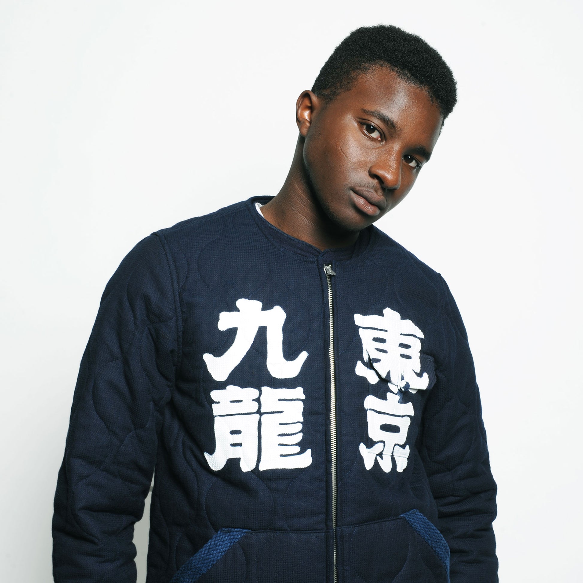 アメリカ軍のフィールドジャケットに用いられたキルティングライナーをイメージし、日本に古くから伝わる「刺し子」の技法、ヴィンテージ感のある剣道着の生地、そして香港のサインペインター・MAN LUK(マン・ルック)さんが手を加えたカリグラフィーをこのシリーズに。