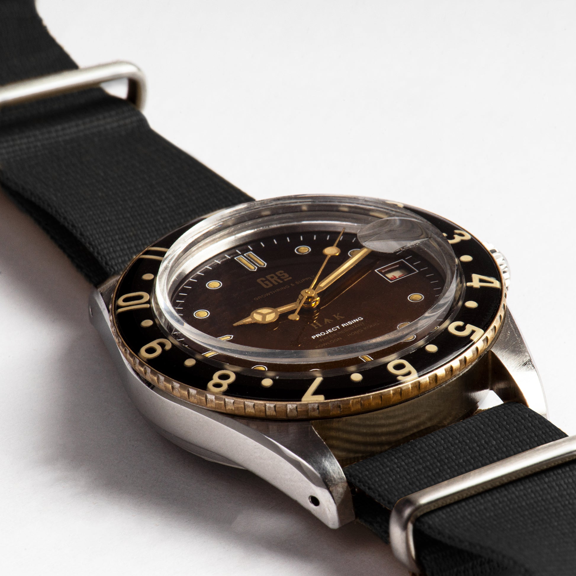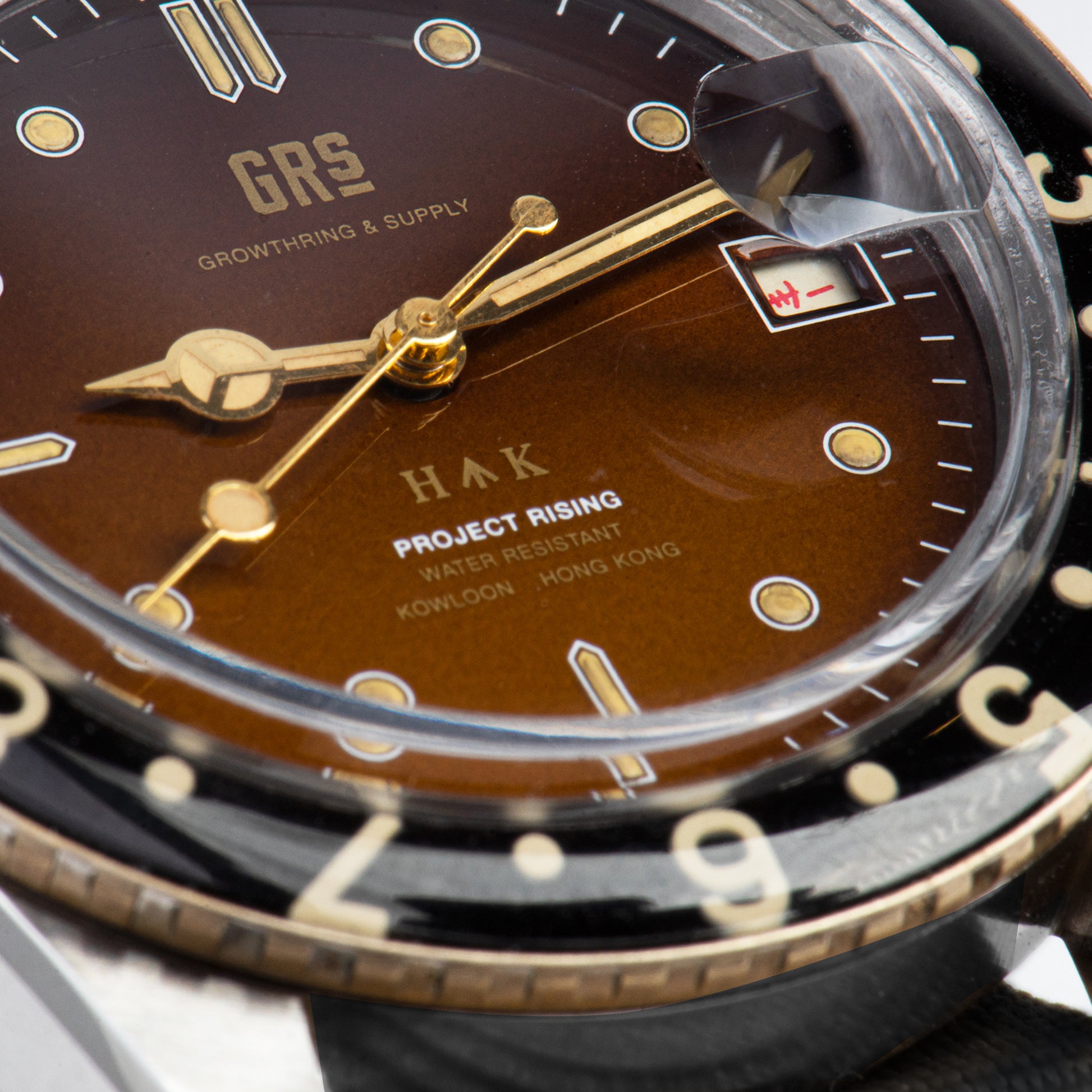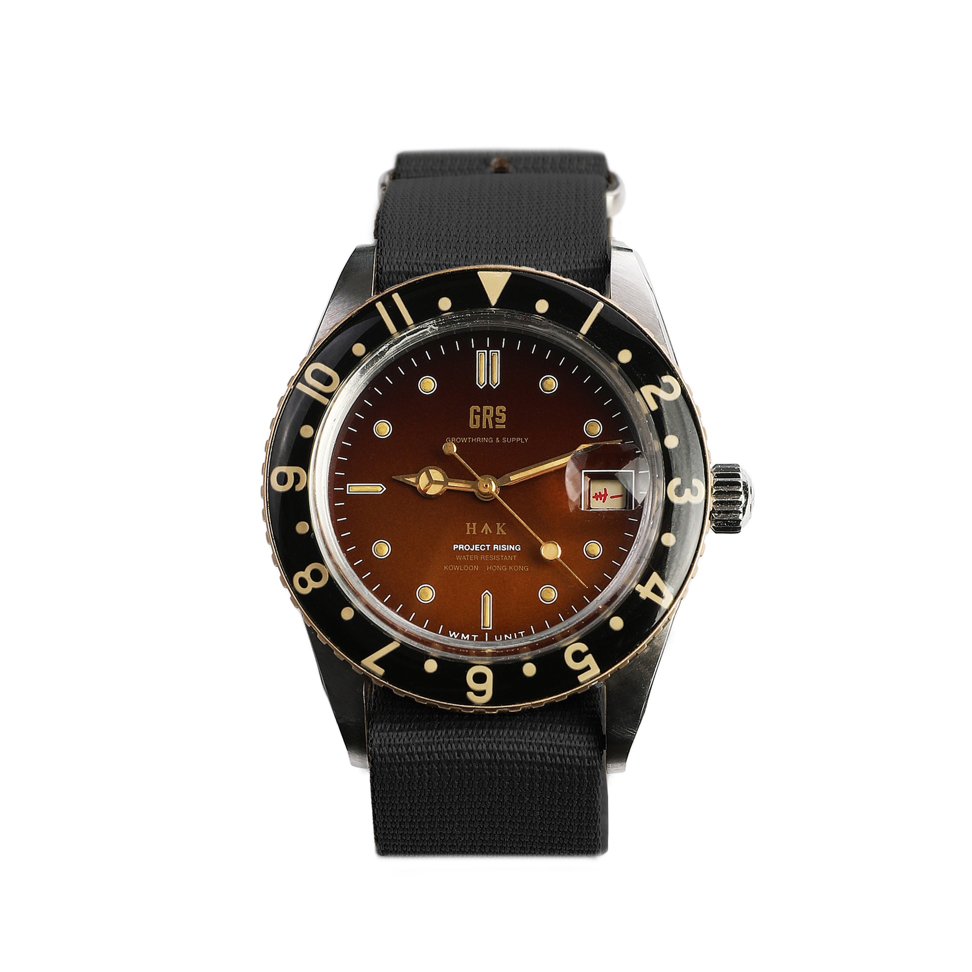 GRSは古い香港製プロダクトを気に入って おり、「香港製ミリタリーウォッチ」が今回の Project Risingと協力する腕時計ブランドによって実現したのである。 PANTON 「GRS H↑K 1959」は、時計の表面に当時の香港建築で見られる「Broad Arrow」が 刻印され、時計針には「HK」の文字を施し、英国植民地時代を彷彿させるノスタルジックなデザインが特徴です。通常「Tropical」と呼ばれるグラデーション効果を用いたこと により、アンティーク調の時計に見られる長期の日光照射から生まれる化学反応作用により、元々の黒い表面がブラウンに変色しています。また双方向ツイストのベゼルは真鍮に特殊な樹脂効果を施 すことで、旧ダイヤル式電話を模倣した作り、ランプ等はフェノール樹脂(Bakelite)を使 うことで,透明感と立体感が備わった構造となっています。今回の 創作で最も興味深いところは、GRSがこの企画のために特別に創作した中国語のカレ ンダー基盤である。これは伝統的なアラビア数字に代わり、香港製のシンボルであ る。PANTON 「GRS H↑K 1959」の部品は、例えば分針、刻度は全体的に人の手によって創り出すPatina効果 によりヴィンテージ感が出ており、かつて長期に使用してたかのような痕跡となる。