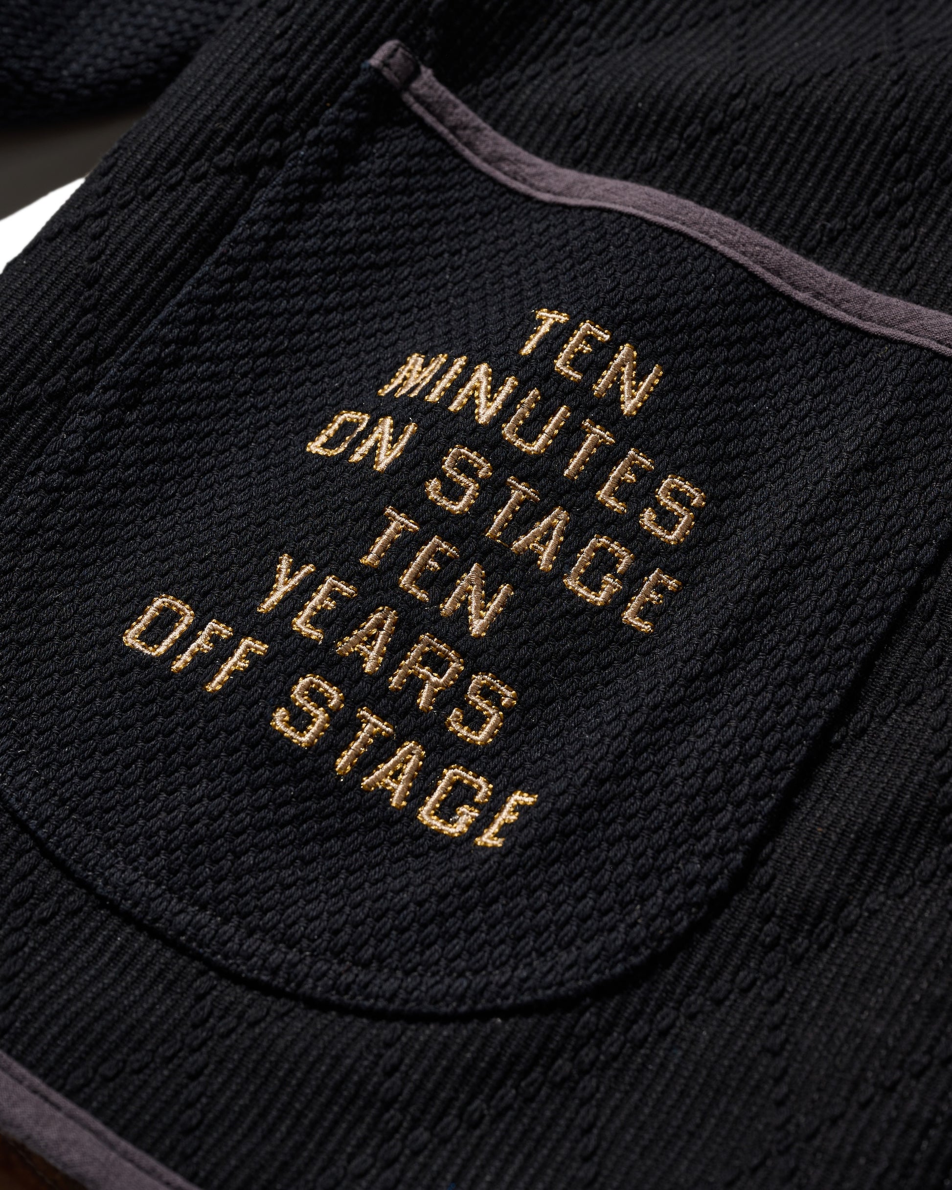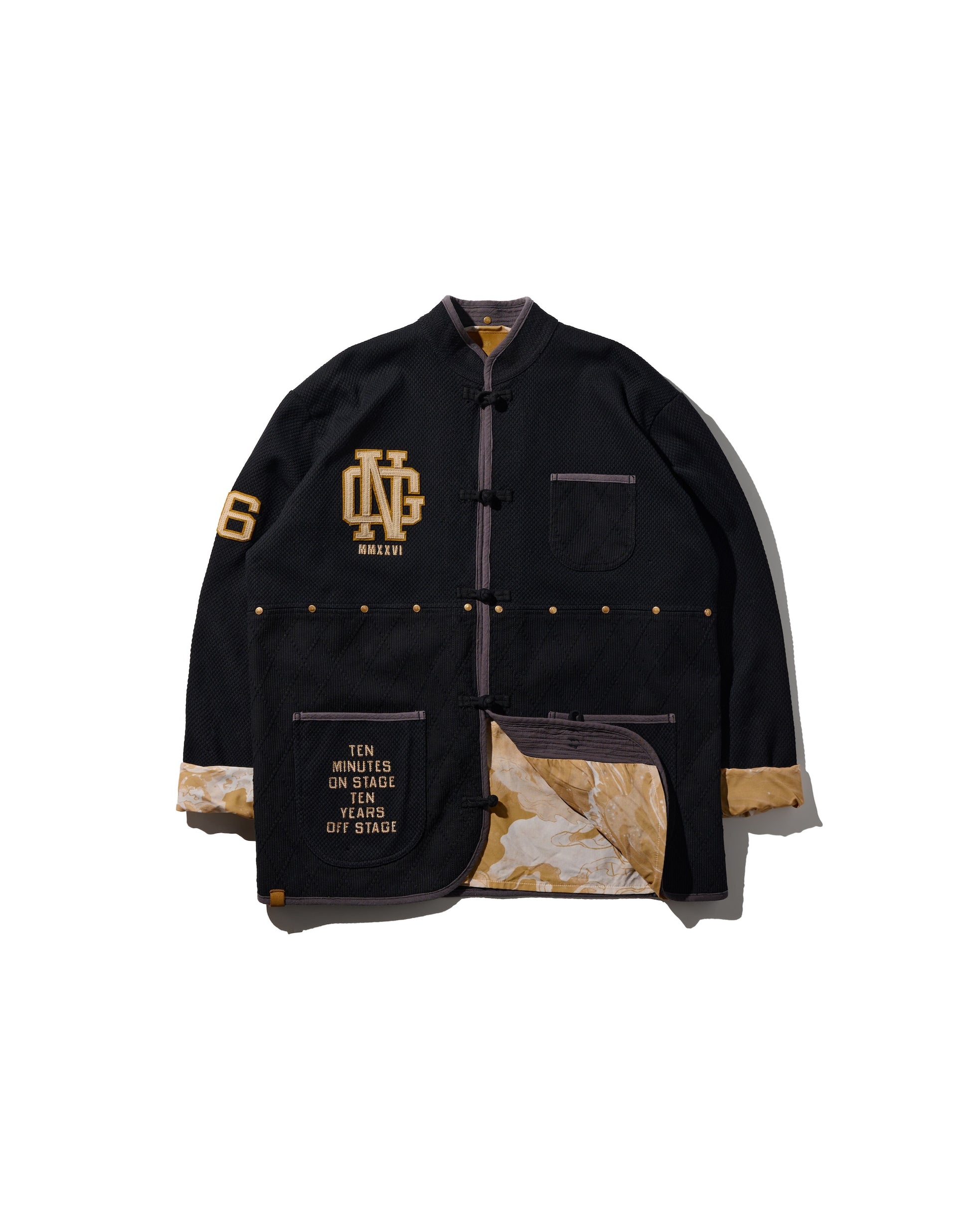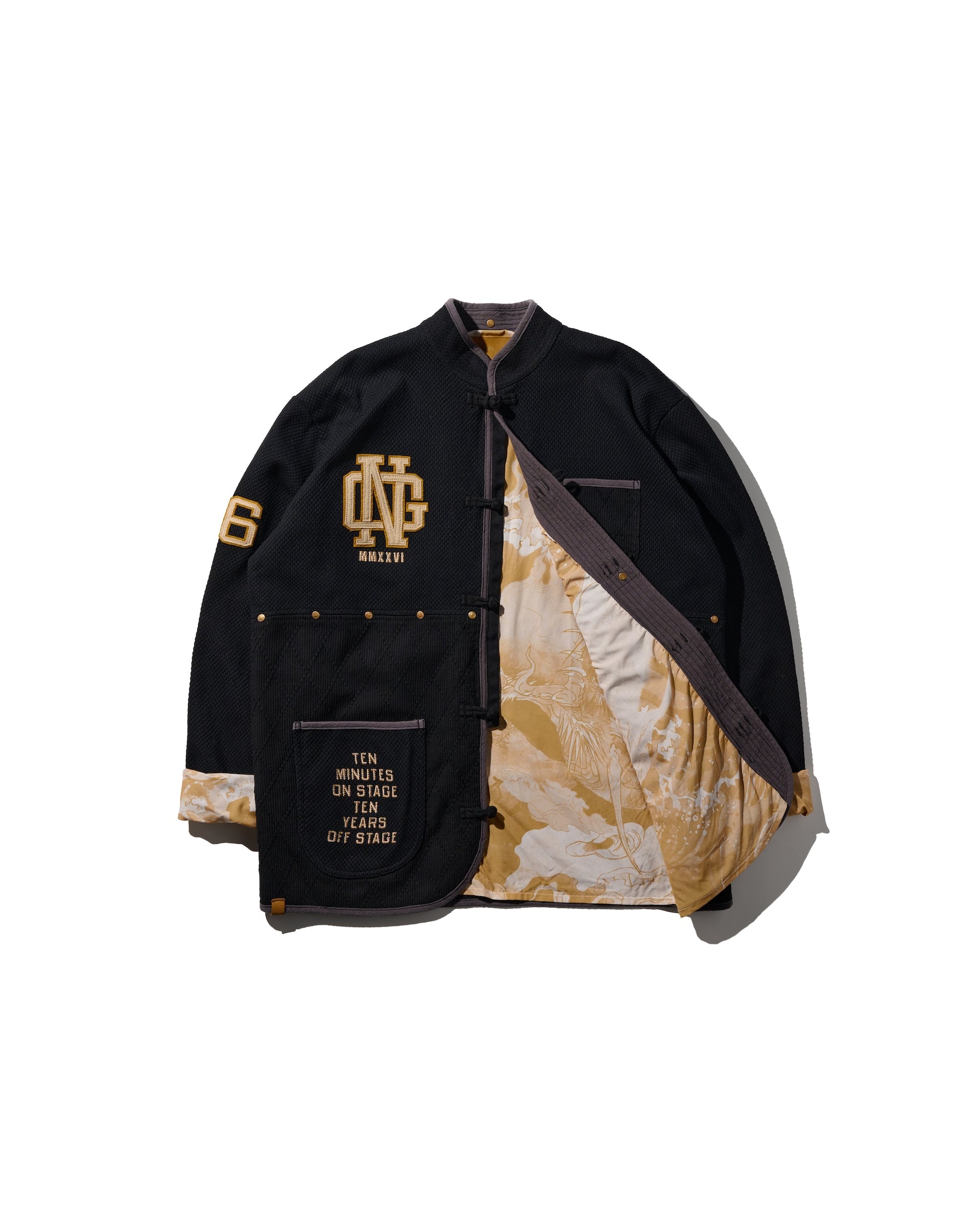 Inspired by the intricate details of the lion drumming activity in lion dance, this design is translated into a Kung Fu jacket crafted with traditional Sashiko embroidery.