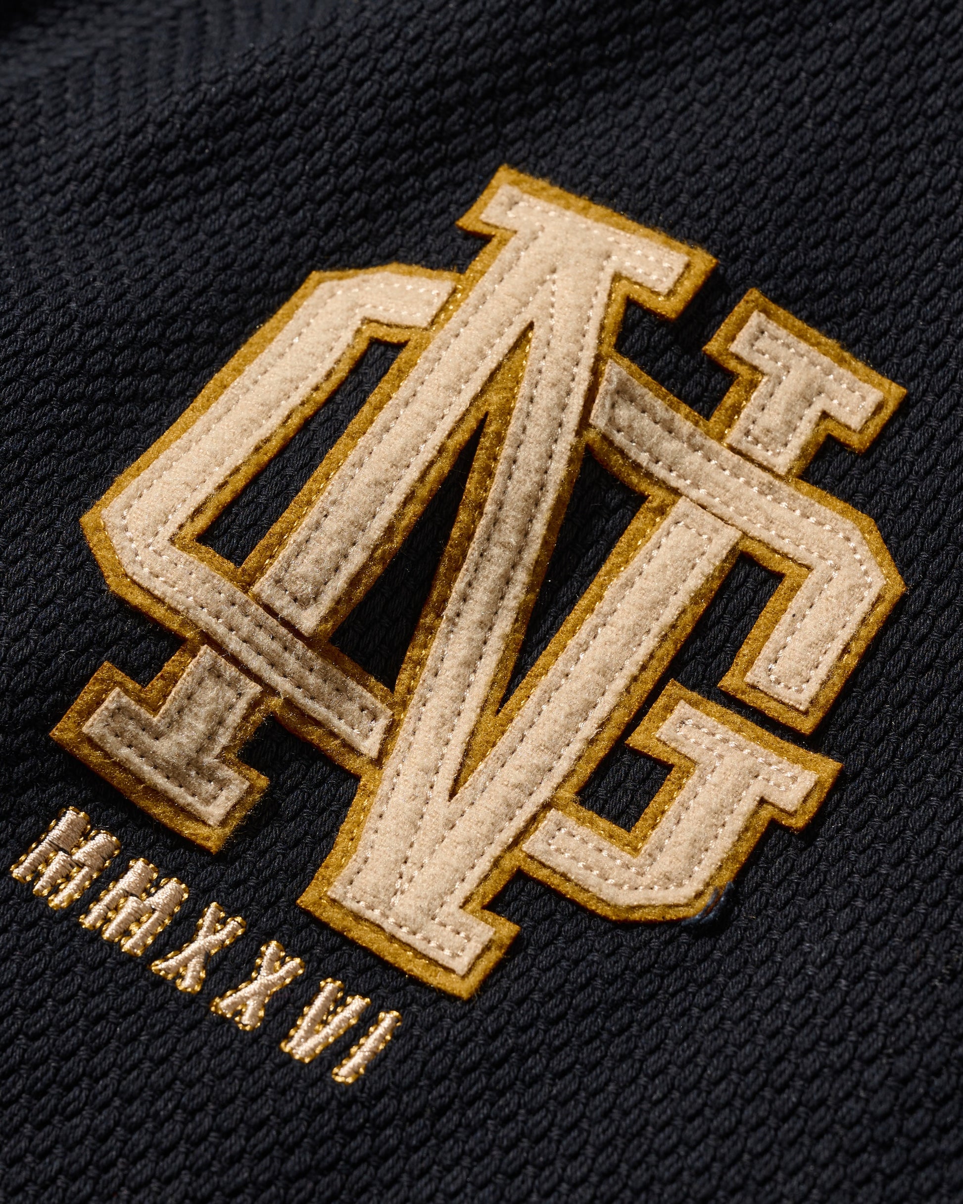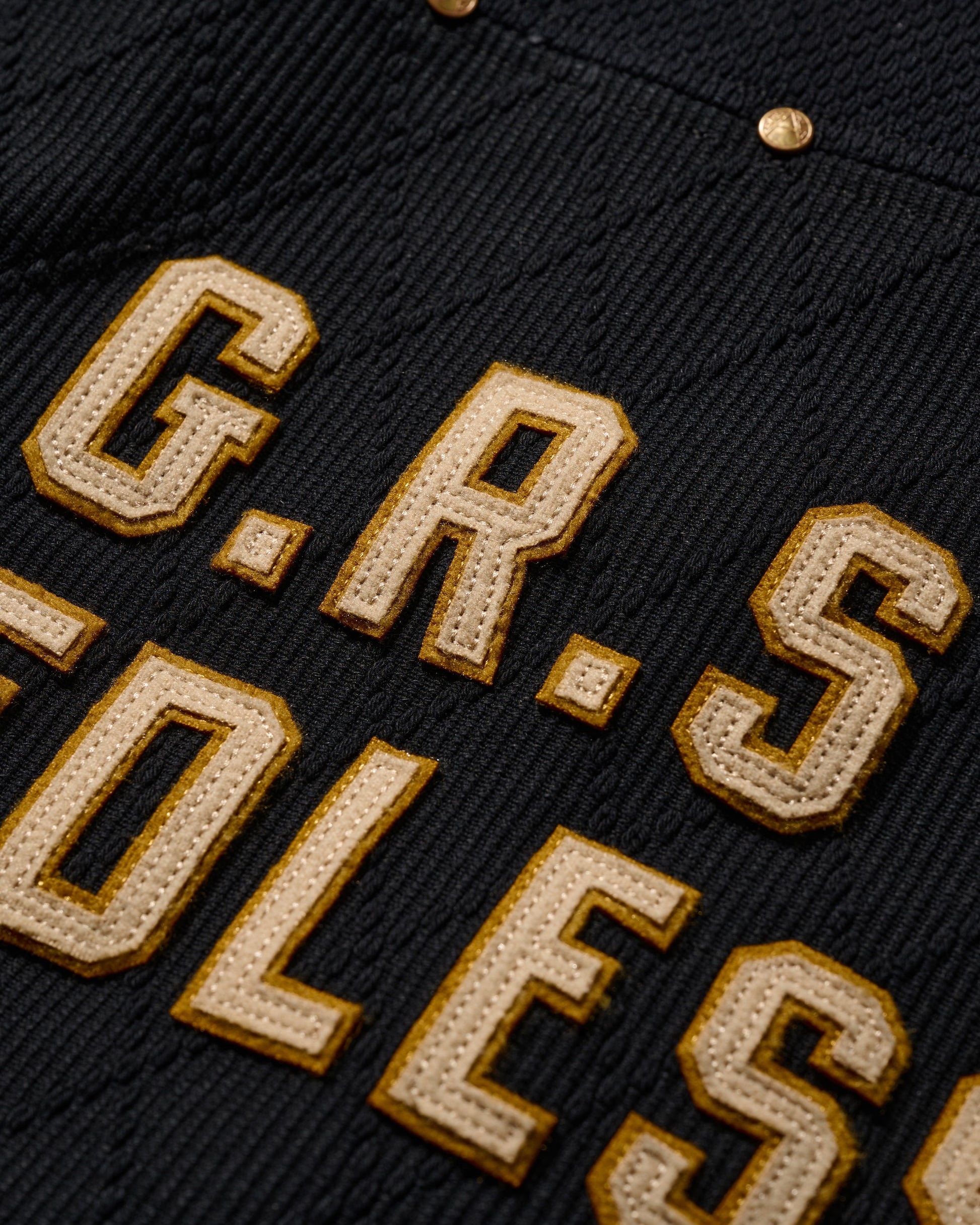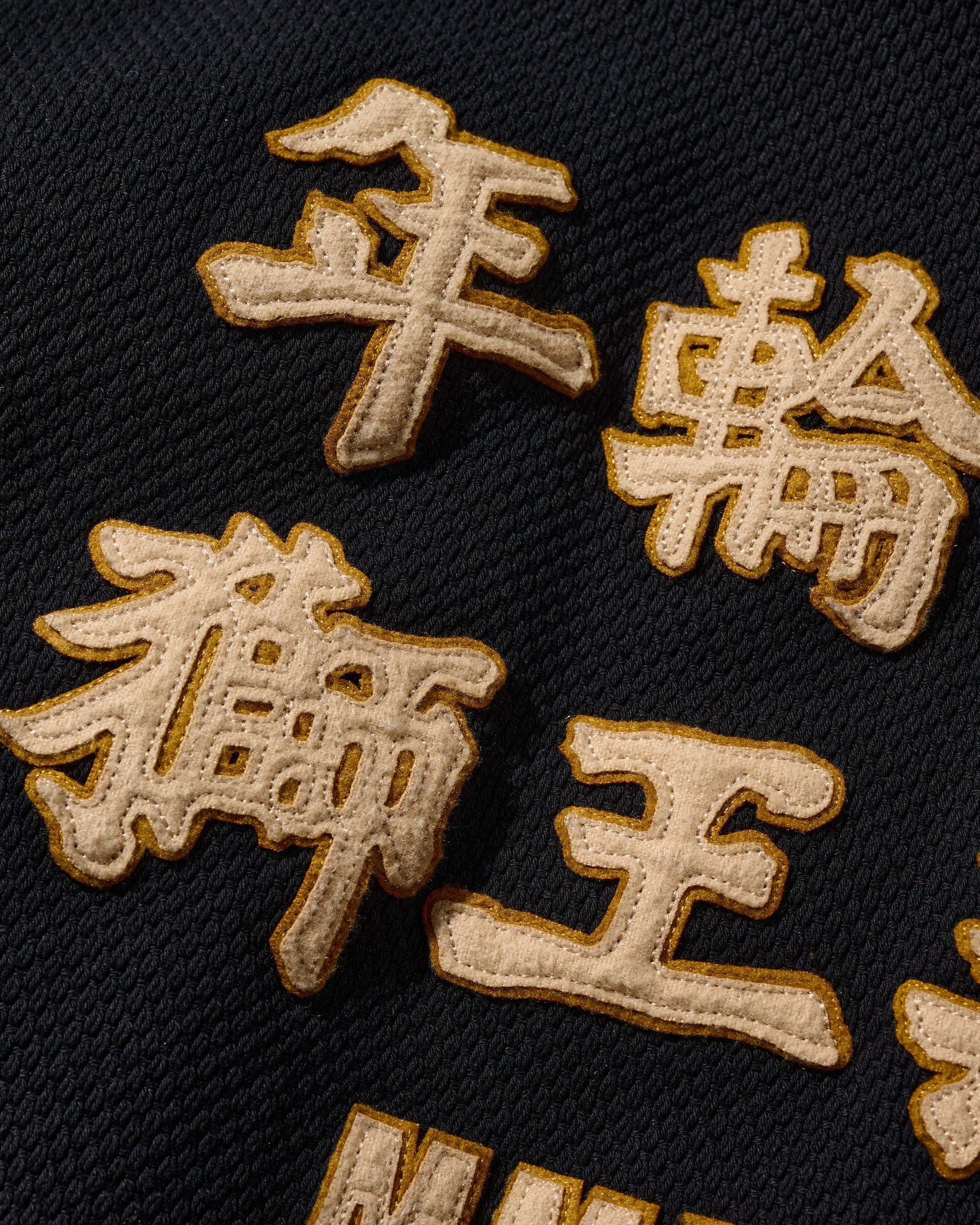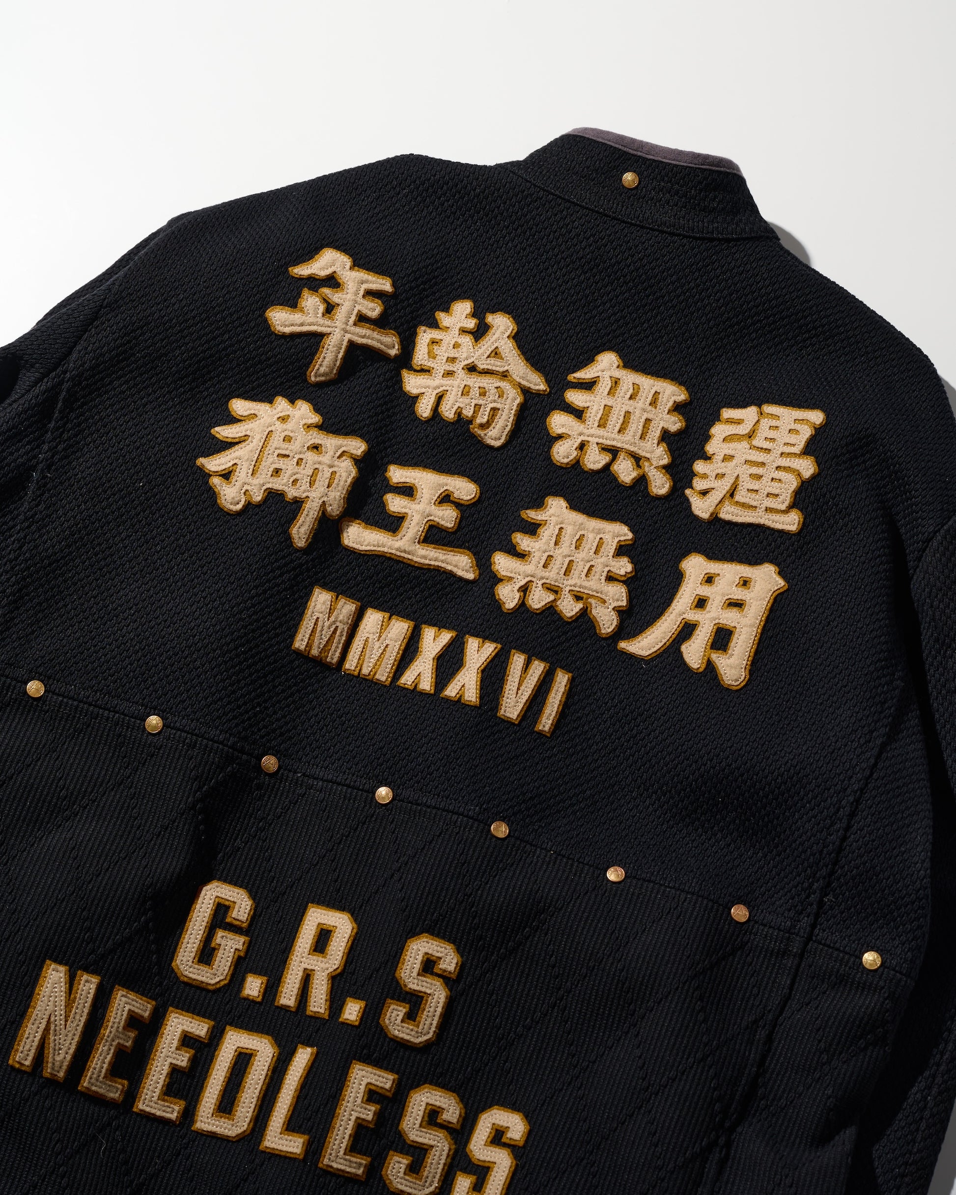 Utilizing KUROZOME natural black dyeing techniques and incorporating emblematic designs from classic American team sportwear, this piece aligns with the theme of "守破離," particularly the "破" element, signifying a break from tradition and reaching a realm that surpasses it.