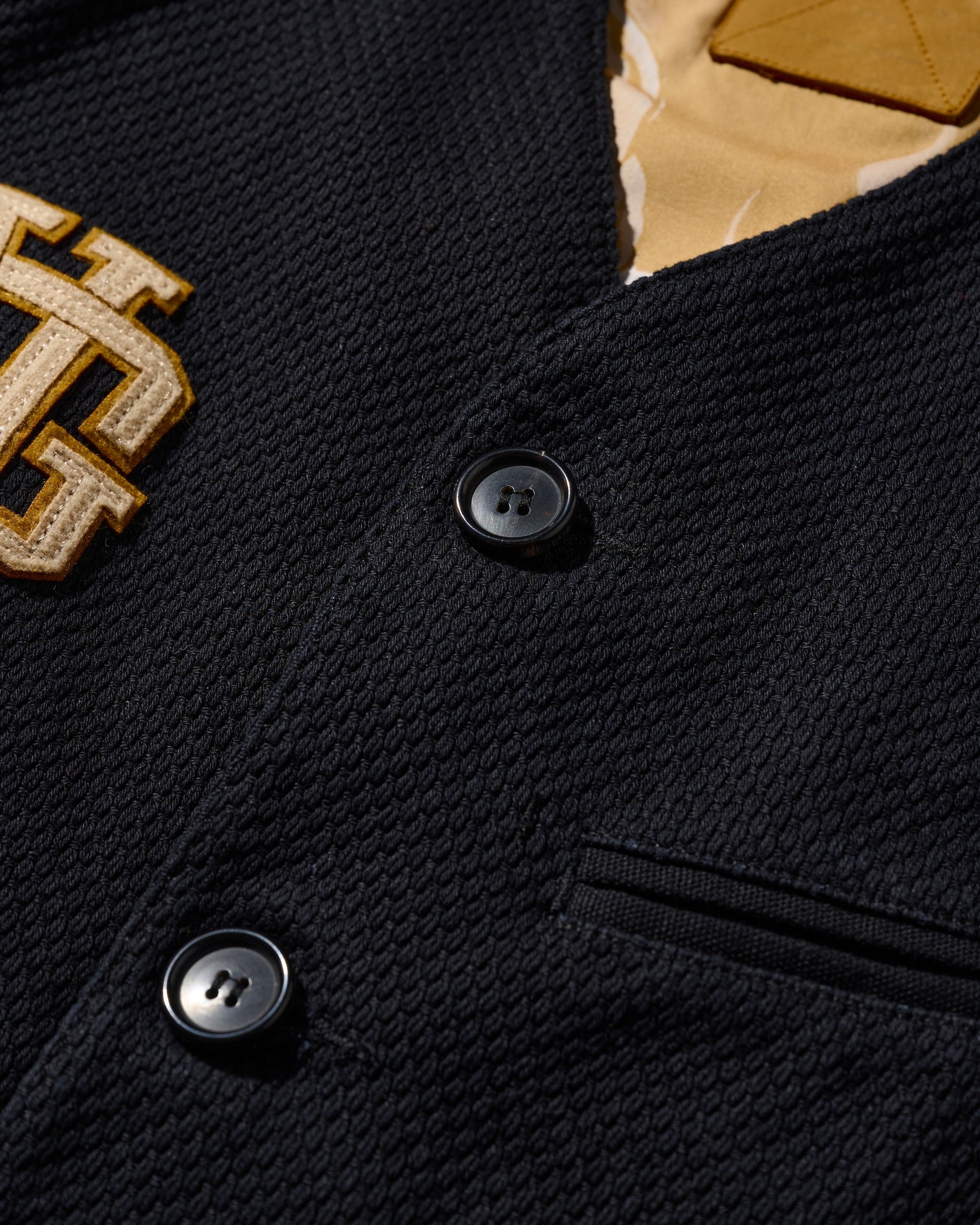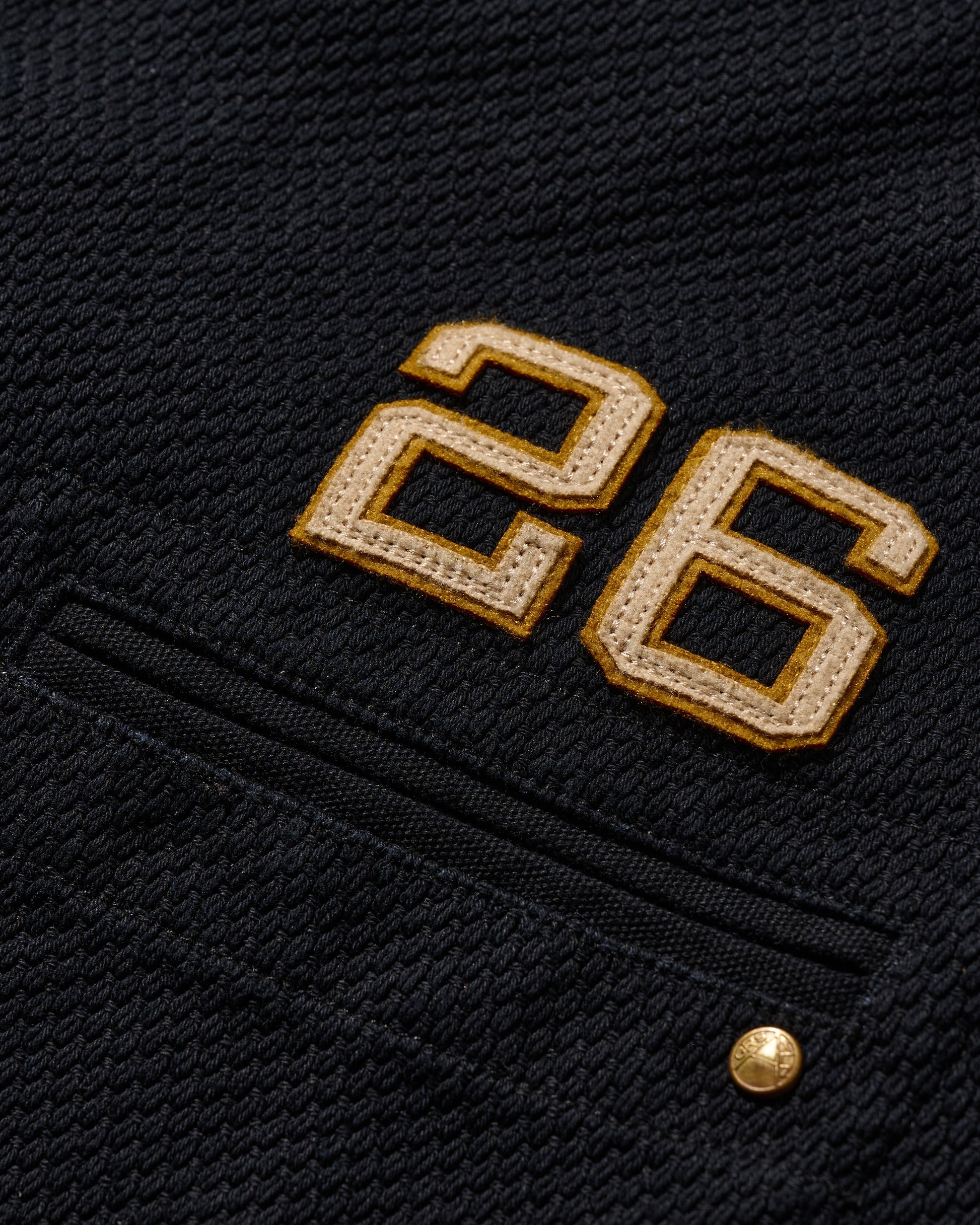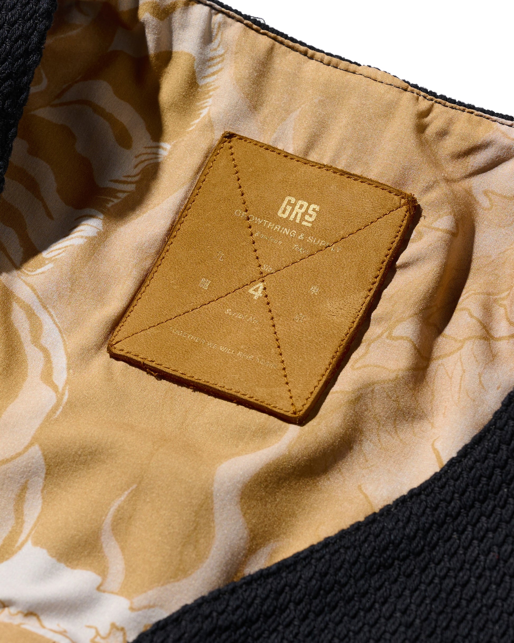 Utilizing KUROZOME natural black dyeing techniques and incorporating emblematic designs from classic American team sportwear, this piece aligns with the theme of "守破離," particularly the "破" element, signifying a break from tradition and reaching a realm that surpasses it.